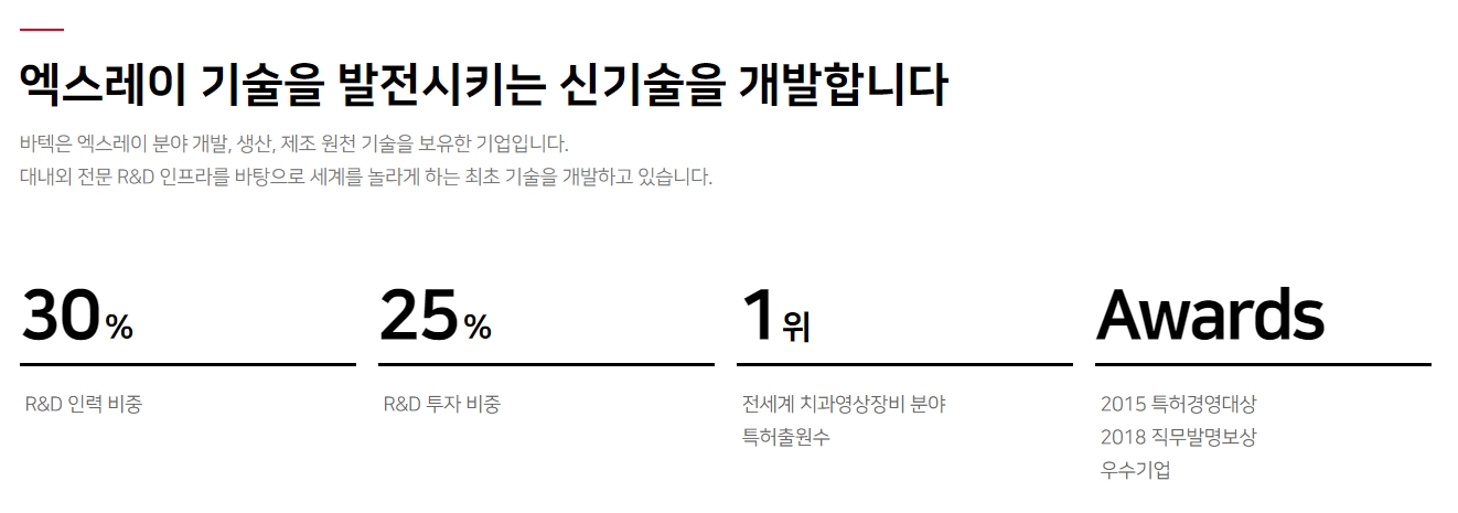 바텍은 1992년 설립되었고, 치과에 판매하는 전문 덴탈의료기기 제조업체입니다. 주력사업은 델탄 이미징으로 치과용 디지철 엑스레이와 CT, 제네레이터를 개발하여 국내외 현지법인과 대리점을 통해 판매를 하고 있습니다.