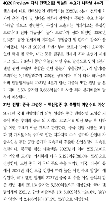 하나금융투자에서 덴탈 헬스케어 부분의 리포트가 나왔습니다. 일단 덴탈섹터가 코로나로 피해를 본 섹터이지만 다시 회복을 할 것이라는 얘기구요.(구강이 노출되는 치과치료라서 코로나때 많은 사람들이 기피했다고 합니다)
