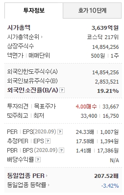 시총은 3,600억원. 외국인보유율이 20%대입니다. PER과 PBR은 여기는 조금 잘못나온 것 같네요.