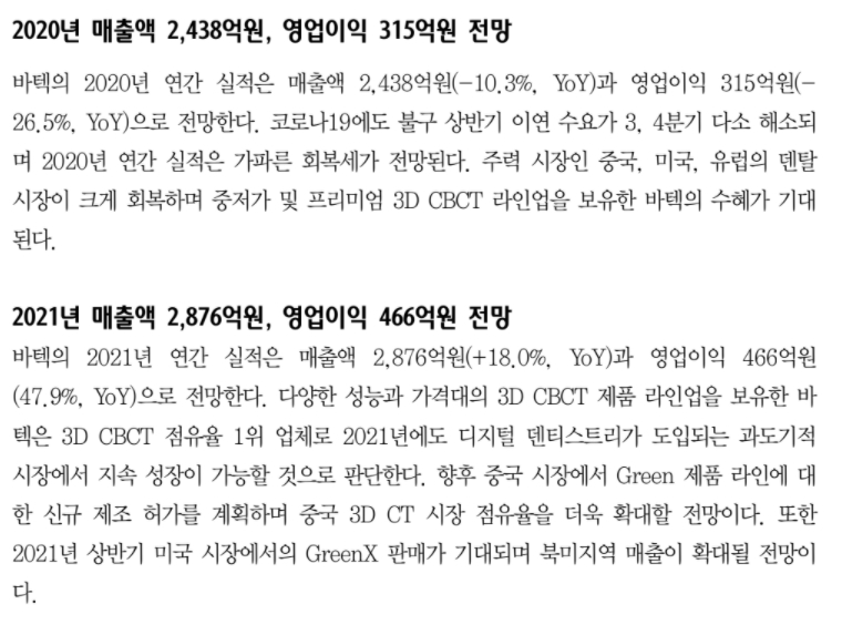일단 예상 전망치는 위와 같이 늘어난다고 예측은 했으나 중국이 코로나로 인한 상황이 100% 신뢰가 가지 않는 상황에서 중국발 매출이 높은 바텍의 실적이 예상대로 나올지는 모르겠습니다.
