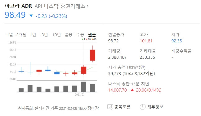 그런데 클럽하우스는 미국 신생기업의 플랫폼이기 때문에 아예 상장조차 되어 있지 않습니다. 그럼 관련주도 없느냐? 있습니다. 바로 이 클럽하우스가 아고라 플랫폼을 기반으로 구동되고 있다고 알려져 있는데요, 덕분에 아고라 ADR이 엄청난 주목을 받게 됩니다.