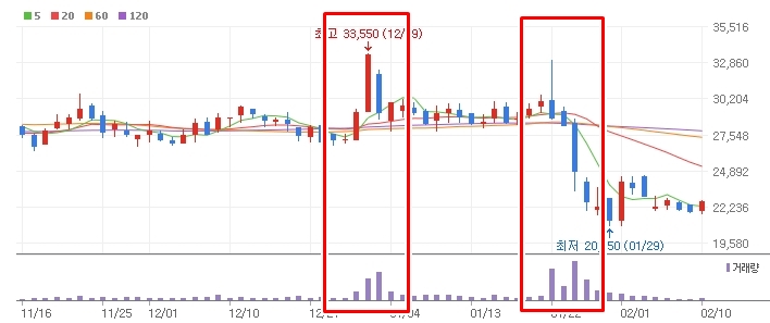 연말에 터졌던 거래량과 상승분은 모두 1월 말, 거래량 실린 장대 음봉이 나오면서 모두 털렸습니다. 이게 손바뀜은 아니고 그냥 주주분들의 울며겨자먹기 물타기입니다. 뭐 2만원 안깬걸 다행으로 알아야 하나요;;