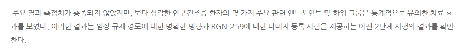 다만 주요 결과 측정치가 충족되지는 않았습니다. 그러나 주요 엔드포인트, 서브그룹 데이터는 P-Value값이 잘나왔죠.(전체 데이터 공개는 하지 않음... 이게 조금 그렇습니다)
