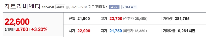 2021.2.10. 기준 지트리비앤티의 주가입니다.