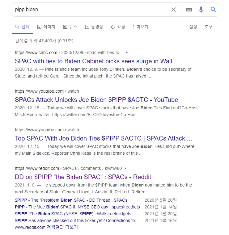 저는 개인적으로 조금은 포트폴리오에 담가볼 생각입니다. 일단 가격적인 메리트가 있구요, 투자가성비도 괜찮을 것으로 보이니다. 일단 인맥들이 정말 출중하구요, 왜 정부 관련 국방, 항공우주쪽인지도 아실 겁니다. 리스크는 사실 시간입니다. 언제 될지 모르니까요(스팩은 인수 못해서 해산하면 공모가에 이자붙여서 돌려줌). 그래도 한번만 터지면 미국 스팩주는 몇 배는 기본으로 수익이 가능할 것으로 보입니다. 이상으로 바이든 관련주 PIPP에 대해서 알아보았습니다.