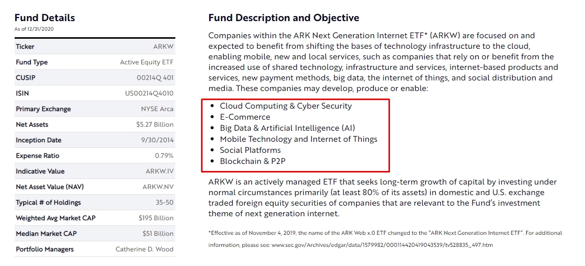 보시면 설명과 소개가 나오구요, ARKW에는 클라우드 컴퓨팅, 전자암호, 이커머스, 빅데이터, AI 등등의 기술을 보유하고 있거나 개발하고 있는 회사들에 투자를 한다고 나와있습니다.