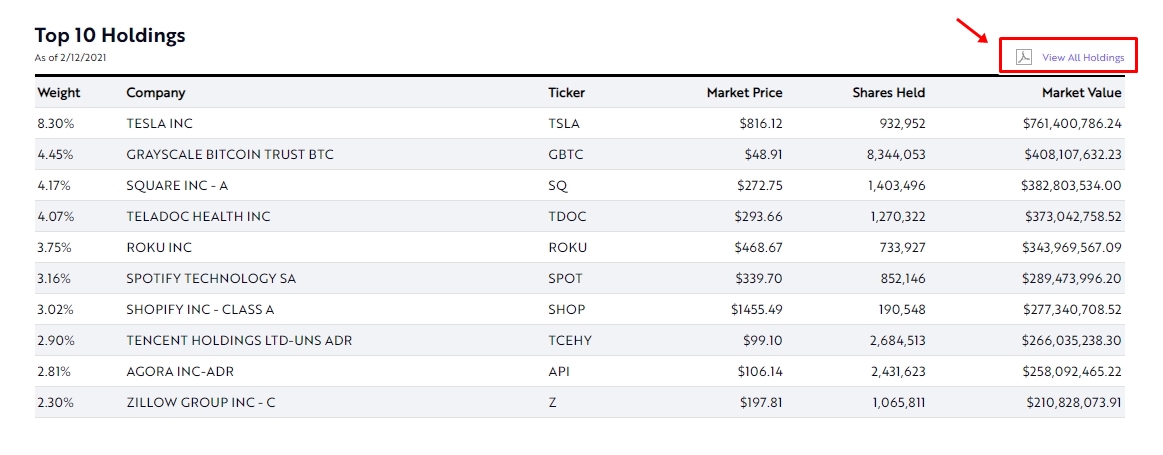 우리는 ARKW의 보유종목을 봐야 하니까 맨 아래로 가시면 TOP 10 홀딩스가 나오는데요, 전체를 봐야 하니까 위쪽의 View all holdings를 선택합니다.