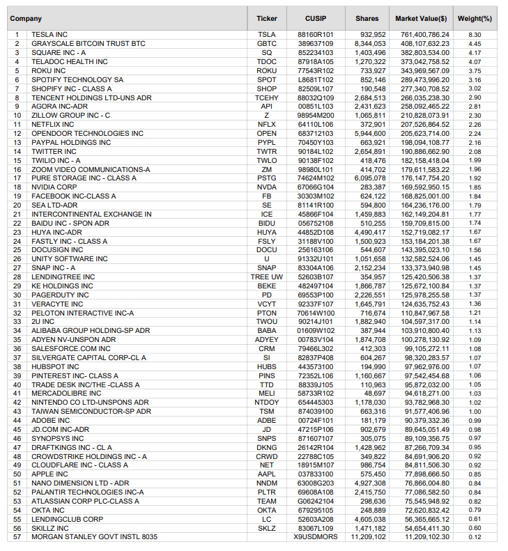 이게 ARKW의 모든 구성종목입니다. 보시면 시가총액과 구성종목의 비중이 동일한 것을 볼 수 있습니다. 이말은 즉, 구성비중이 높은 종목은 이미 많이 상승하거나 덩치가 큰 기업이 되었을 수도 있다. 테슬라를 보면 알죠.