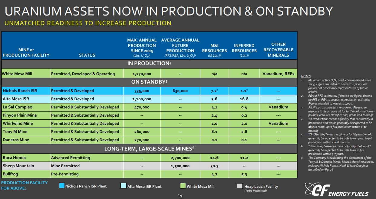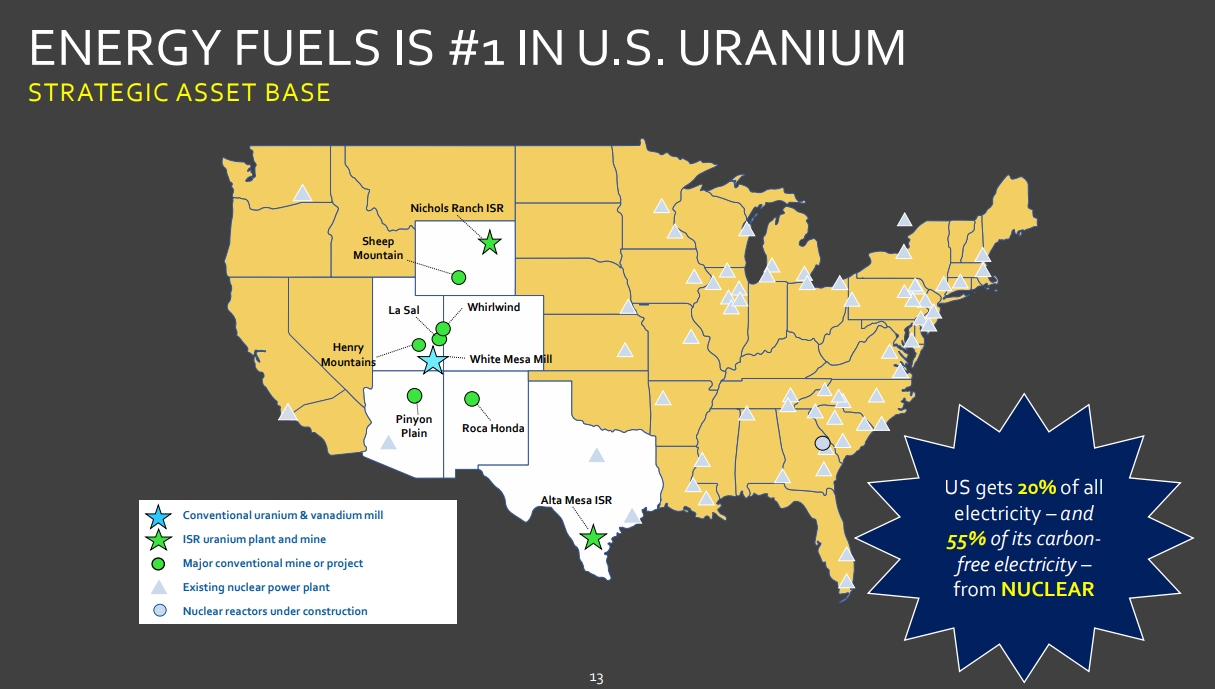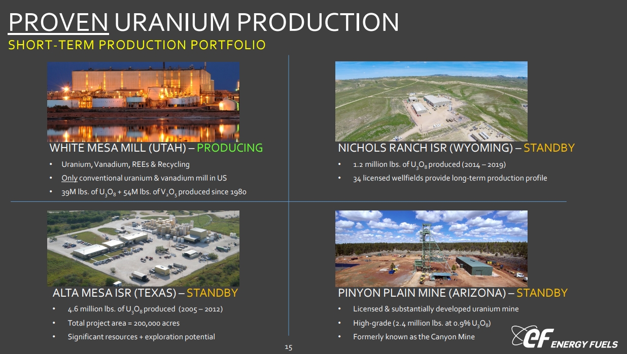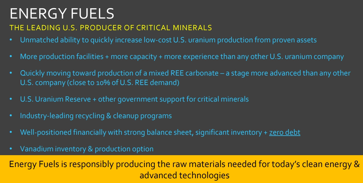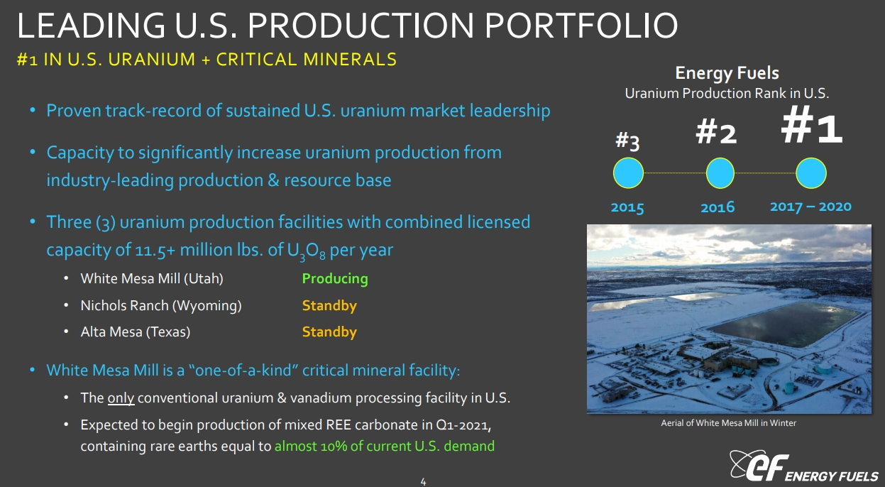 에너지 퓨얼스는 미국의 주요 광물 생산업체로써 저 비용의 미국 우라늄 생산을 신속하게 증가 시킬 수 있는 능력이 있다고 합니다. 또한 미국의 어떤 우라늄 회사보다 더 많은 생산 설비와 더 많은 용량, 더 많은 경험까지 가지고 있죠.