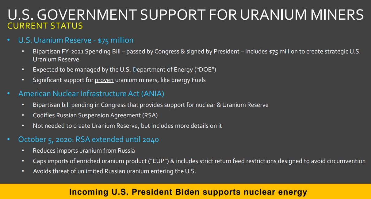 러시아에서 우라늄을 들여오는 것을 보류한(RSA)가 법안으로 제정되었으며, 이게 2040년까지 연장되었다고 합니다. 한마디로 우라늄을 생산하려면 자기네들밖에는 없다는 얘기.